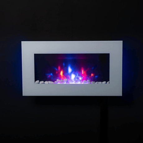 TruFlame 89cm Wide Wall Mounted Curved White Glass - Two stylish variants: logs or pebbles finish