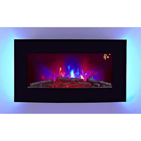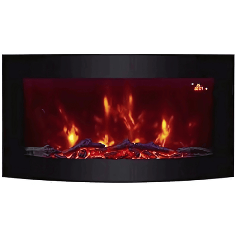 TruFlame 89cm Wide Wall Mounted Curved Black Glass - Four stylish variants: logs or pebbles finish