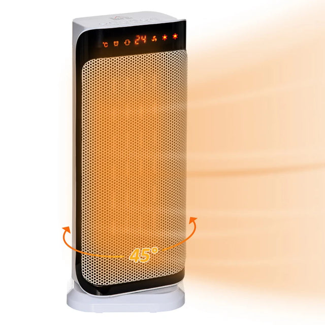 The HOMCOM 2000W Electric Heater offers a perfect blend of style, functionality, and portability. Designed to complement any space, its compact size allows placement on a desk, table, or floor. With oscillation up to 45°, it efficiently spreads warmth across your room, making it ideal for autumn and winter comfort.